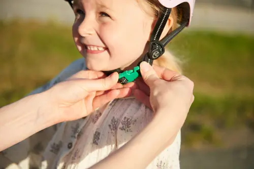 Barn i förskoleåldern bör använda en hjälm med grönt spänne. Spännet öppnar sig om barnet skulle fastna när det leker eller klättrar.