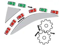 Sammanvävning - kugghjulsprincipen. Anvisningsmärket, sammanvävning, "kugghjulsprincipen" upplyser om att två körfält eller körbanor löper samman till ett och att förarna skall anpassa sig till de nya förhållandena på platsen.