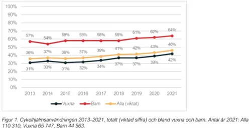 Användningen av cykelhjälm ökar bland både barn och vuxna. NTF:s årliga cykelhjälmsmätning, som bygger på drygt 100 000 observationer, indikerar en ökning av cykelhjälmsanvändandet på tio procentenheter de senaste sju åren. I Väst har användningen ökat med fyra procentenheter bland vuxna och en procentenhet bland barn jämfört med förra årets mätning.