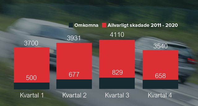Sommaren, och i synnerhet perioden juli - september, innebär högsäsong för de allvarliga olyckorna i trafiken. Baserat på olycksdata för de senaste tio åren ökar dödligheten med 35 procent och antalet allvarligt skadade med 10 procent under det tredje kvartalet jämfört med resten av året. Det beror oftast på att hastigheten är högre när olyckan väl inträffar och att det är fler oskyddade trafikanter ute. Vägarna är fina och många har bråttom till sitt resmål. Trafikintensiteten är hög och många kör längre än vad de är vana vid och blir trötta. Bilen är också tyngre lastad än vad den vanligtvis är.